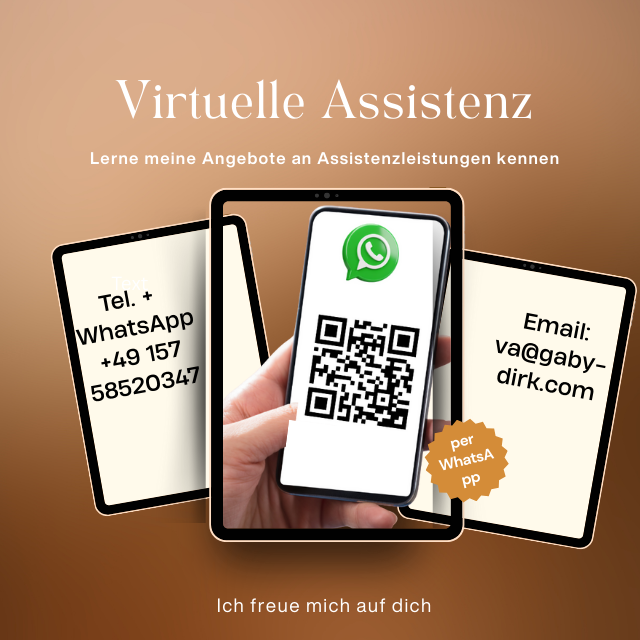 Bitte zögere nicht, mich bei Fragen oder dem Bedarf an weiterführenden Informationen zu kontaktieren. Du erreichst mich telefonisch und per WhatsApp unter +49 157 58520347 und per E-Mail: va@gaby-dirk.com.